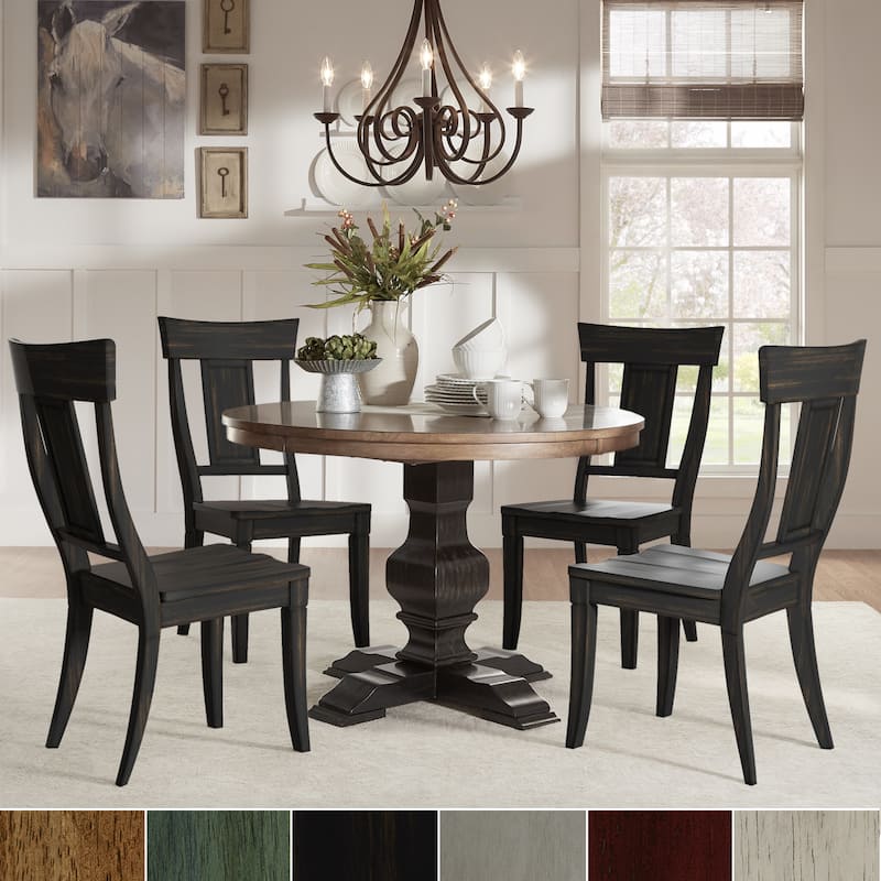 Add a beautiful, rustic look to your dining space with this round Eleanor wood dining set from iNSPIRE Q® Classic. The traditionally designed table features a pedestal style base and an antique, oak wood finish. The chair's graceful panel back adds a sense of antique charm to this design. This round table is perfect for limited spaces, smaller formal dining rooms, or eat-in kitchens. The chairs are available in several distressed finishes, including neutrals and bright hues, so you can mix or match colors and express your unique design taste.