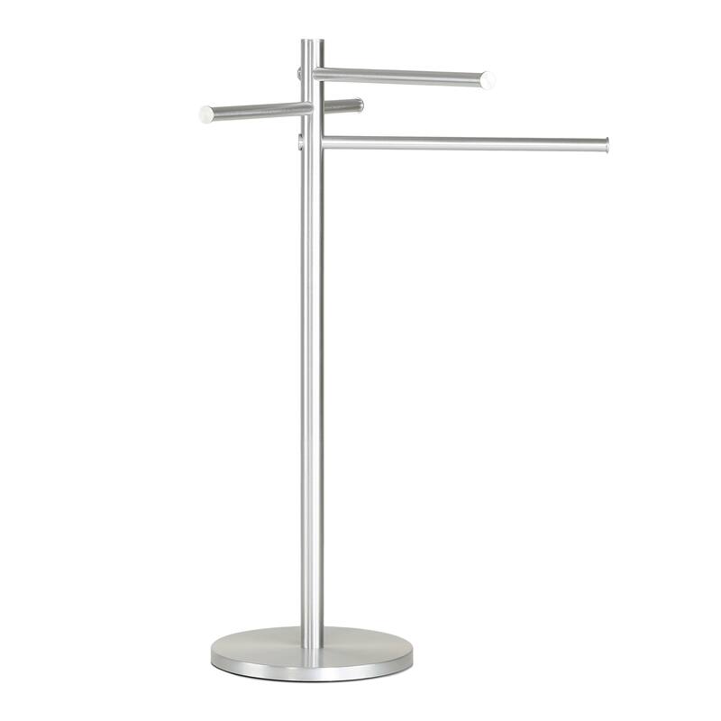 This free standing towel stand keeps your favorite towels neatly displayed. It features a heavy metal base and a rust-resistant brushed aluminum finish. Each individual bar slides in and out giving you full range control of the quantity and size of your towel needs. This item has a contemporary design, making it a great addition to update the look of any bathroom.