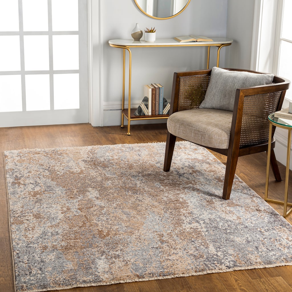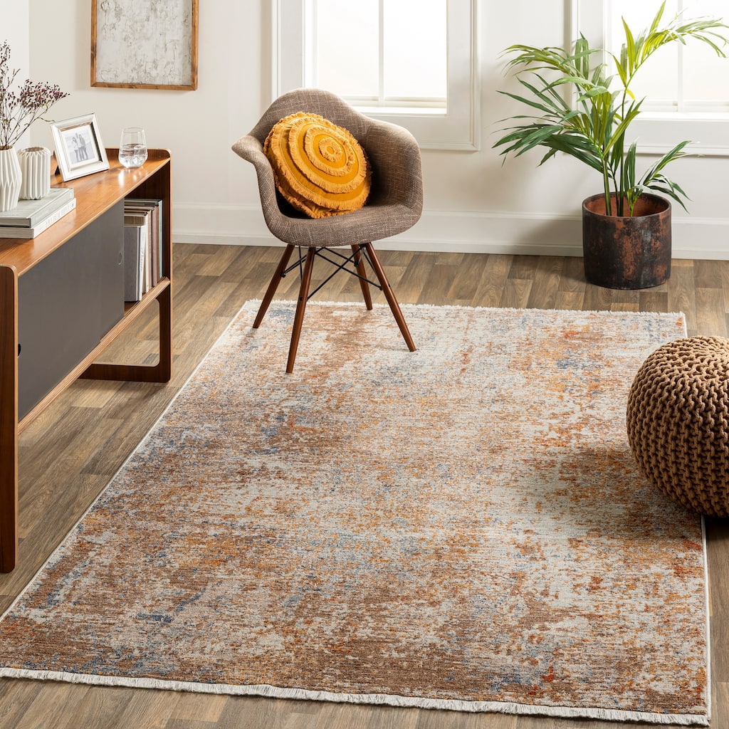 High-contrast hues of blue and orange pop against cool cream and grey in the Fabius rug. This piece features a hip, abstract design with the look of splattered or peeling paint. Perfect for high-traffic areas like a living room, kitchen, or foyer. Machine woven in Turkey with 100% polyester and a low pile of 0.39 inches. A rug pad is recommended to prevent slippage and movement. Spot clean with a white cloth.