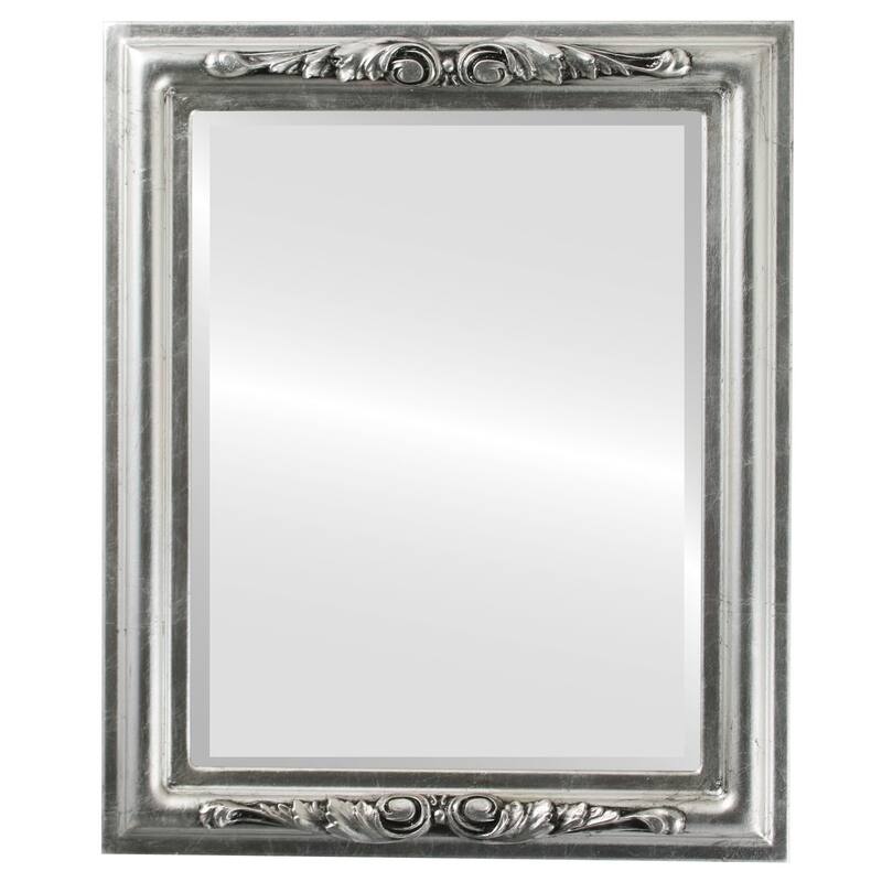 A classic frame with styled ornamentation. Hand gilded and aged with cold black antique by skilled artisans. This dark silver leaf finish is timeless on this beautiful frame. The Framed Mirror features a Gallery Quality Hand Finished Wooden Frame with a Distortion Free 1" Beveled Mirror. This Framed Mirror arrives ready to hang with hardware pre-installed for vertical or horizontal hanging. This Framed Mirror arrives ready to hang with hardware pre-installed for vertical or horizontal hanging.