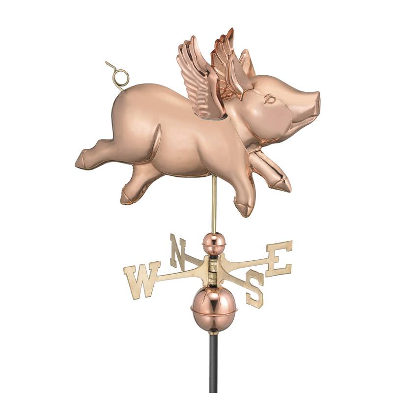 A flying pig is a happy pig. This one can't wait to spread his wings and adorn the rooftop of your home, garage, cupola, barn or gazebo. Good Directions' pure copper weathervanes are unsurpassed in style, quality, and durability - perfect for the house-proud homeowner. Bring The Joy of Outdoor Living to your home with this heirloom-quality piece.