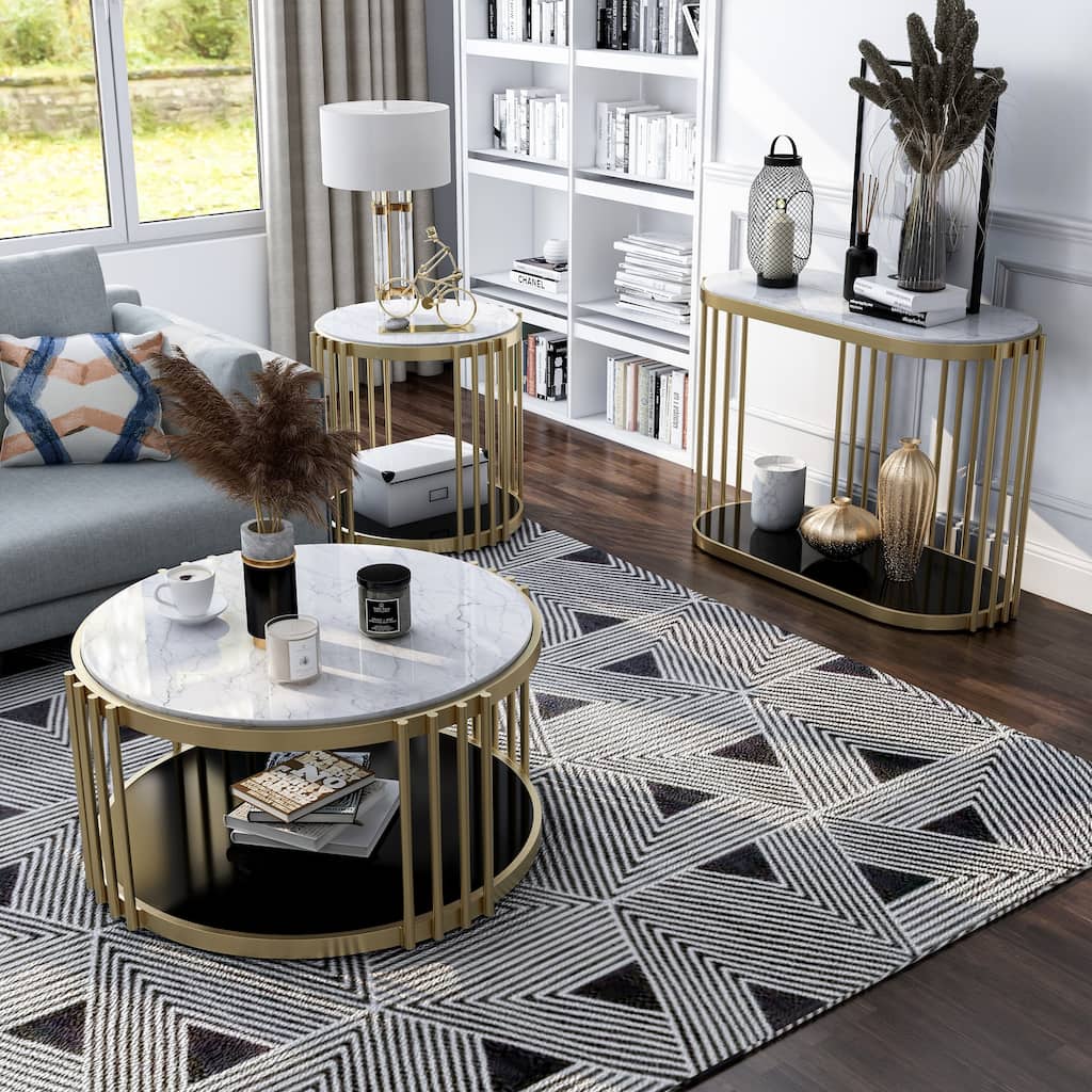 Roberts Glam Brass and White 42-inch Faux Marble 1-Shelf Drum Sofa Table by Furniture of America