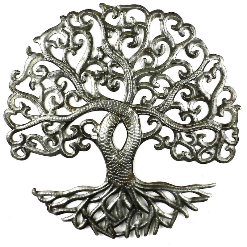 Add a touch of nature to your home or garden with this handcrafted 14-inch Tree of Life made from recycled steel drums in Haiti. This eco-friendly piece depicts a tree with curly branches and is suitable for indoor or outdoor use.
