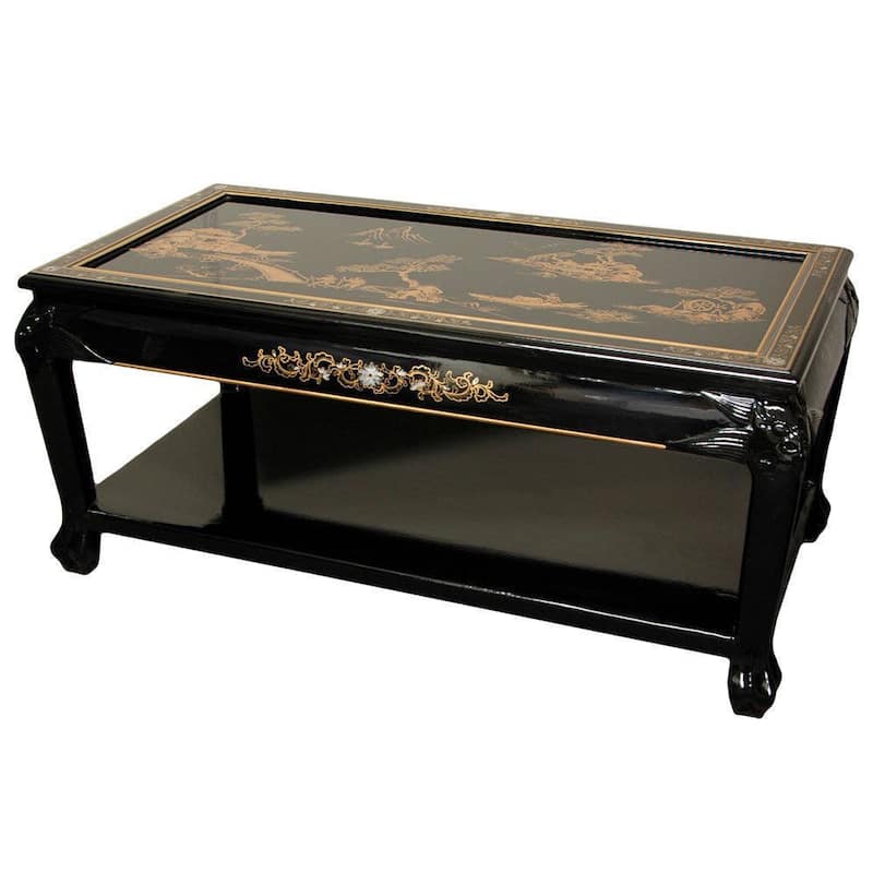 Handmade Black Lacquer Landscape Coffee Table with Shelf (China) - 40.00"W x 20.00"D x 18.00"H