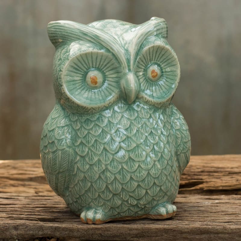 Handmade Ceramic 'Light Green Wise Owl' Celadon Statuette (Thailand)