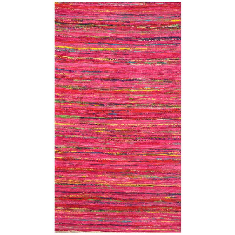 These one of a kind flat-weave rugs are hand-tufted in a beautiful design that will enhance any living space. The chenille is woven onto the tufted cotton backing. Such a versatile rug can be used anywhere in your home. The thickness of the rug is 0.25 inches. Colors include pink, gold, blue, and green.