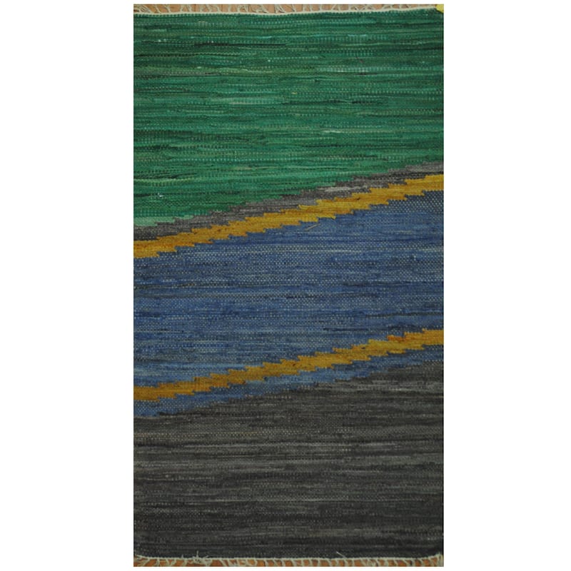 Add a pop of color and texture to your home decor with this stunning Handmade Wool Kilim from India. The flat-weave floor covering features a unique slit-weave design in shades of blue, green, grey, and gold. With a knot count of 160, this kilim is a one-of-a-kind piece of world art that will elevate the look of any living space. Use it as a floor covering or as a decorative wall hanging to create an eye-catching display.