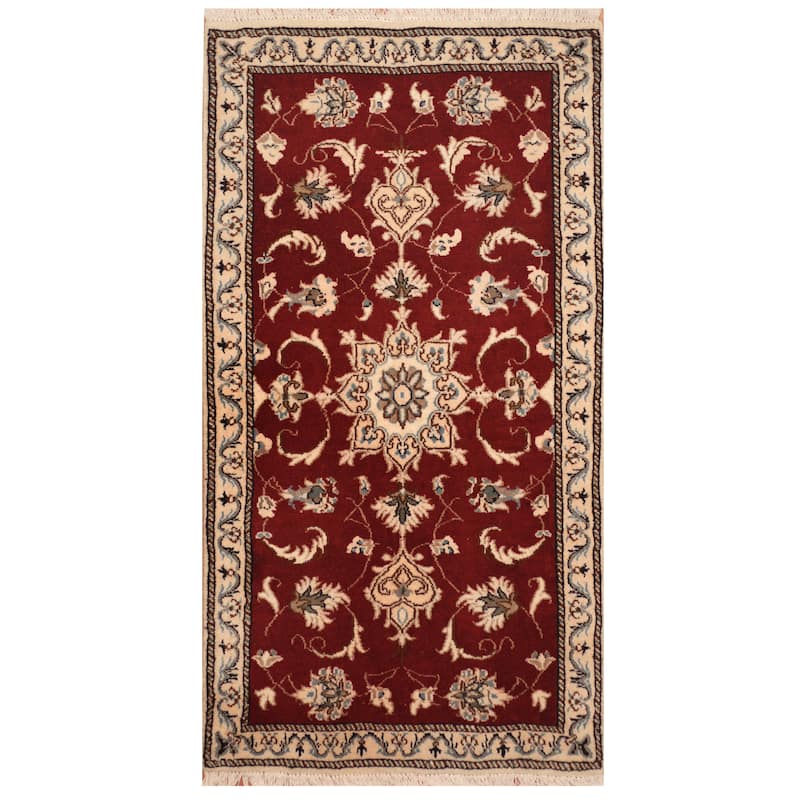 This rug is a unique piece of world art that will enhance your living space. As a weaving center, Nain dates back to the 1920s. At first, it was one of the areas that produced Isfahan carpets. Then beginning in the 1930s, it developed its own identity for very fine precise workshop carpets on a cotton foundation. Nain is a city in Iran in between Isfahan and Yezd. The knot count for this rug is 200. This rug is 100-percent hand-spun wool, and is made with all vegetable dyes. The pile height is 0.5 inches. Colors include red, ivory, blue, and navy.