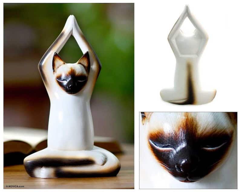 As depicted in the sculpture, a Siamese cat reaches toward the sky while sitting in the lotus position. Bali's Nengah Sudarsana masterfully hand-carves and paints the albesia wood sculpture.