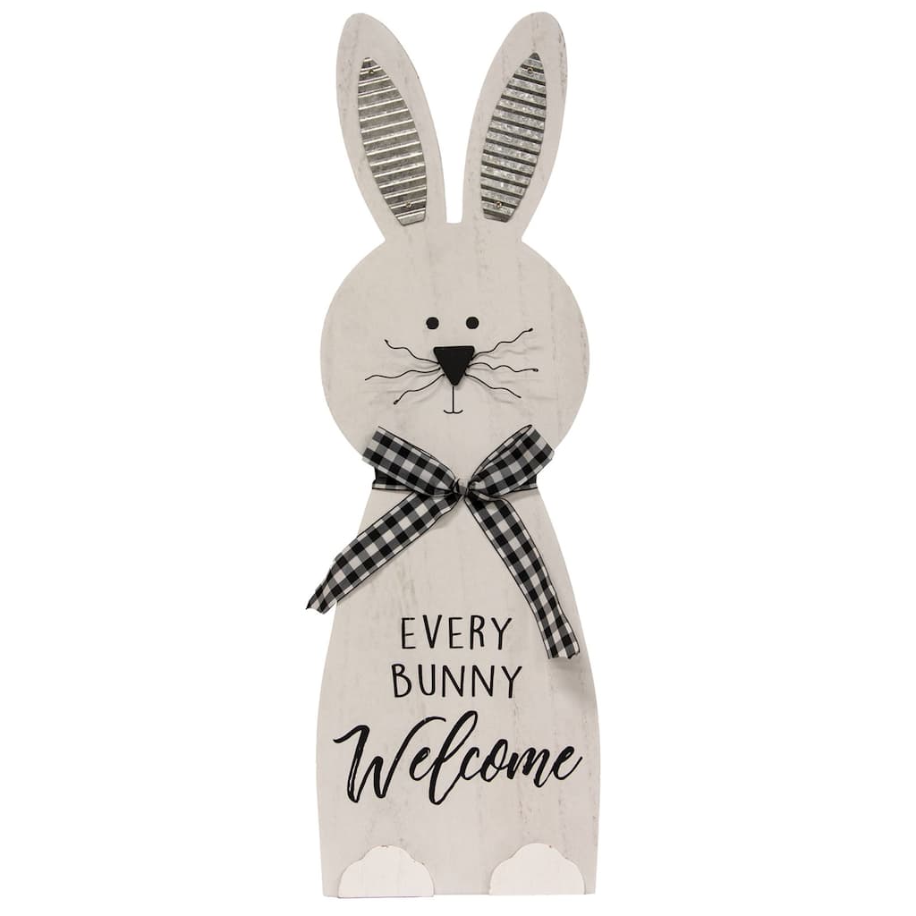 Happy Easter Bunny Pedestal is a freestanding tabletop accent perfect for Easter decorating. Pedestal features a wooden bunny cut-out on a wooden dowel that is attached to a wood block base and it reads, "happy Easter" in white text. Bunny has a distressed white finish with exposed edges for a rustic finish and it measures 17.5" high by 6.1" wide by 2.5" deep.