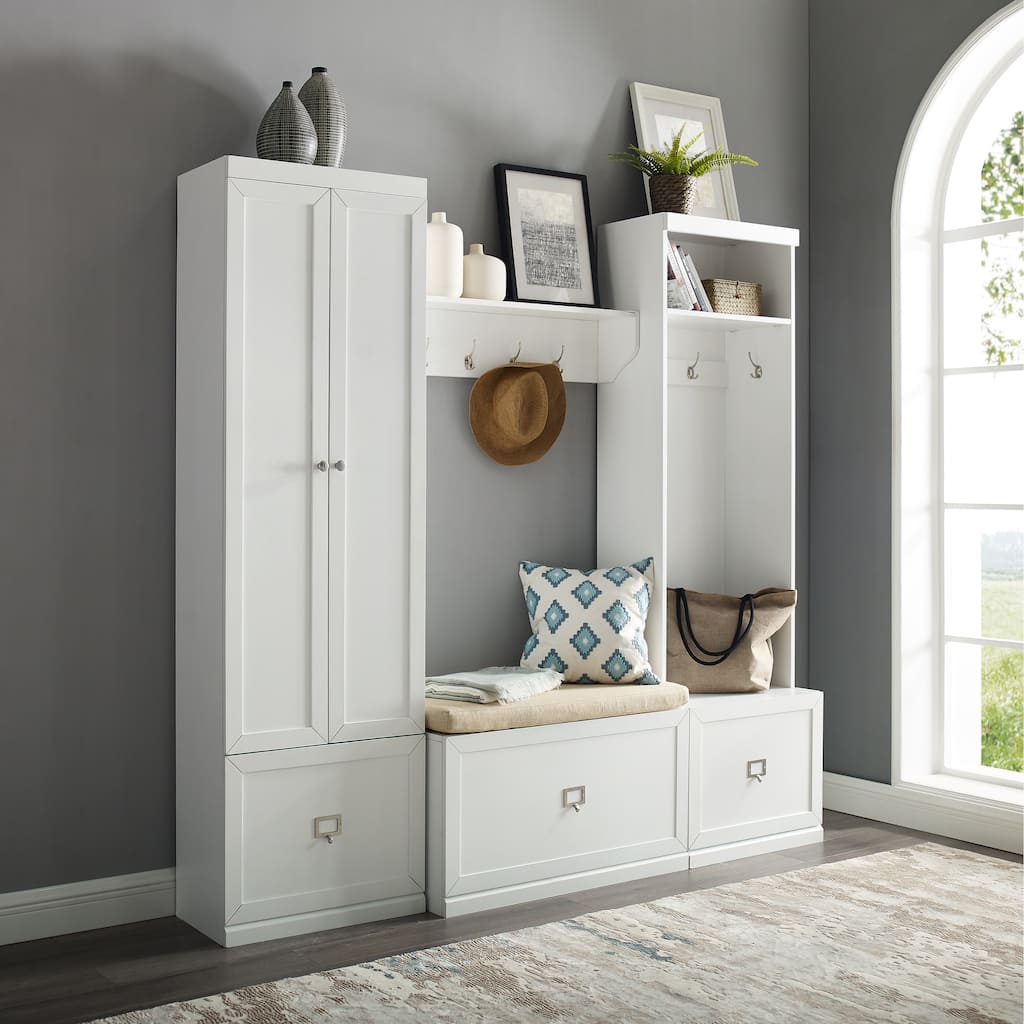 Take your home organization to the next level with the Harper 3pc Entryway Set. Comprised of two pantry closets flanking either side of a hall tree, this set is a multi-functional dream. The hall tree offers open hanging storage with four large double hooks plus an open-top shelf to tuck small storage baskets. Each pantry closet houses three adjustable and removable shelves that can adapt to a variety of storage needs. When you remove the shelves you can install the large double hooks for hanging storage. Both the hall tree and pantry closets feature large full-extension storage drawers with label holder hardware that can be customized with personal labels. The Harper 3pc Entryway Set can pair modularly with other items in the collection and create the look of genuine built-in storage. - Modern design - White finish - Each pantry closet has one stationary shelf and three adjustable/removable shelves - Each pantry closet has three large double hooks in a polished nickel finish - Each pantry closet cabinet has double doors with concealed hinges and polished nickel hardware - Each pantry closet and hall tree has a full-extension storage drawer with label holder hardware, labels not included - Label holder hardware fits labels up to 2" x 1.25" - Hall tree has four double hooks in a polished nickel finish - Hall tree has a stationary upper shelf - All pieces are modular to maximize space and flexibility