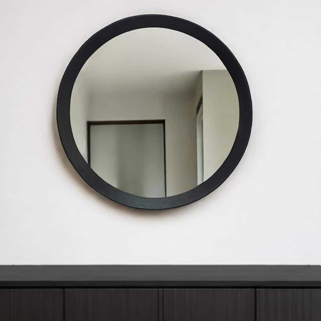 This 24-inch black wood framed bathroom vanity mirror will be the perfect way to add some brightness and utility into your bathroom. Framed on the sides only with manufactured wood, this mirror will bring practical application and fashionable design to your space, adding some contemporary flair to your decor. Ideal to mount above your bathroom sink or vanity in your bathroom, this versatile piece can also be used in other rooms to add practical style and design to your space. Add this exceptional quality mirror to your space for a beautiful reflection and a bit of elevated style. 23.62-inch h x 17.7-inch w x 0.7-inch d.Comes ready to hang in a vertical orientation. Contemporary style mirror with partial unframed and partial black engineered wood frame for a unique look. Features a classic rectangle shape that will look great in most any room. Good for vanity but is also an accent that can work well in living room, hallway, bedroom, lounge or office. The partial frame on either side is made of durable manufactured wood. Versatile for bathroom use over vanity but also is stylish and useful for other rooms in the house.