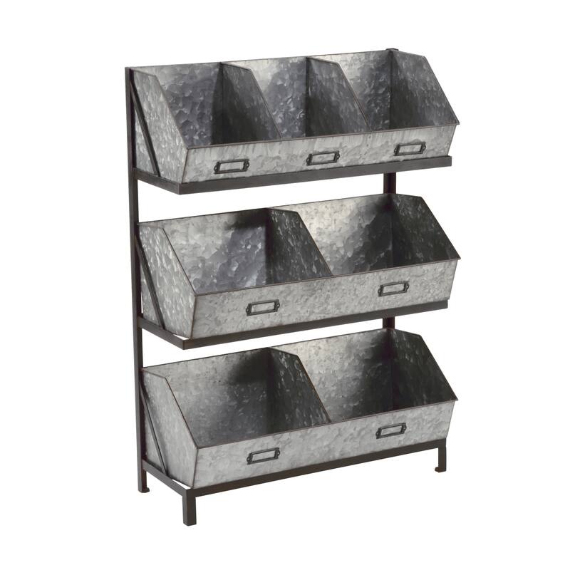 This industrial metal display features 3 tiers and 7 bins and is perfect for organizing miscellaneous items. The various bins feature ample space to organize, display and store socks, bath bombs, accessories, gifts and more! Each shelf can be removed and put on a different level creating different storage or shelf options. Stores can place this item on a tabletop offering a great visual that is easy for customers to reach.