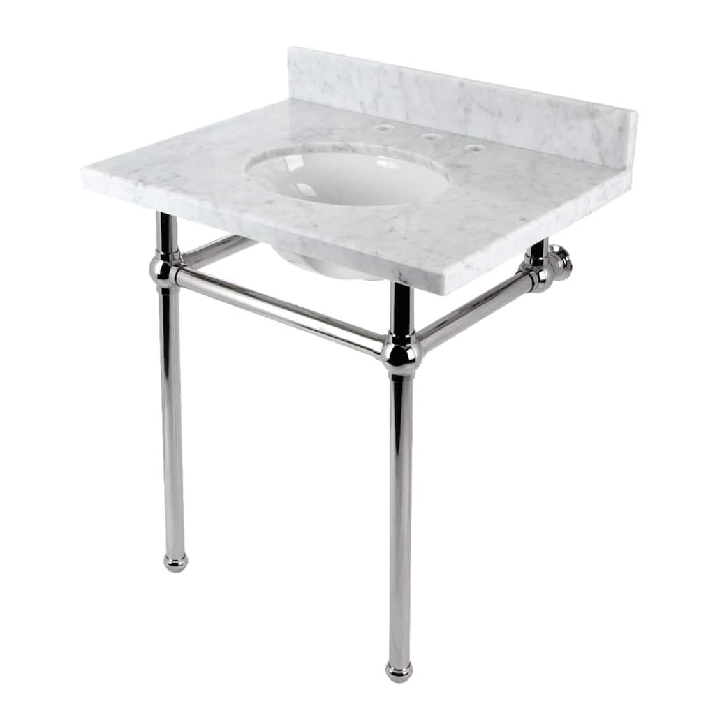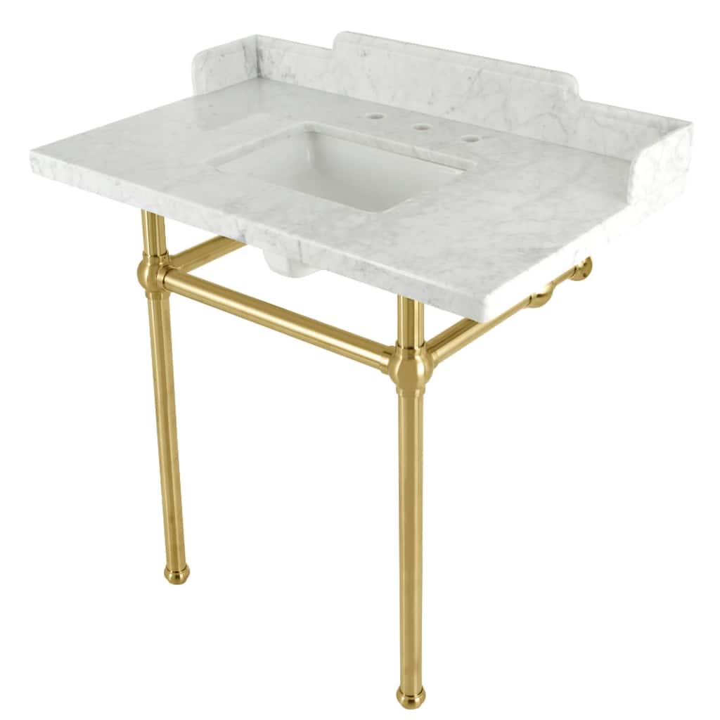With a beautiful carrara marble counter top, this console sink set is a long lasting, durable, and elegant addition to your bathroom. A fabulous alternative where space is limited or tight, making them friendly for the whole family. With different shades and natural designs, otherwise known as veining, no two sinks will be alike. Also for your convenience, anti-slip rubber pads are included with the brass legs to ensure steadiness. Water supply kit, drain assembly, and the faucet are sold separately. Kingston's carrara marble tops are polished, but they are not sealed. Polished marble has a shiny surface and resists stains. Natural stone, even when polished, is still somewhat porous and does remain susceptible to etching by acidic compounds like fruit juice, vinegar, some cleaning solvents, etc. For customers that wish to further protect their investment the marble can be sealed.