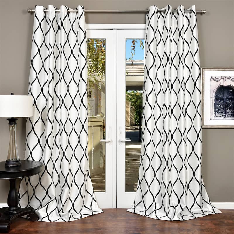 Add a touch of elegance to your windows with Lambrequin Casa's Flocked Faux Silk Window Panel. The contemporary geometric pattern printed on the white faux silk panel gives a unique and fun look, while the sturdy metal grommets make for a hassle-free installation. Enjoy the beauty of silk at an affordable price!