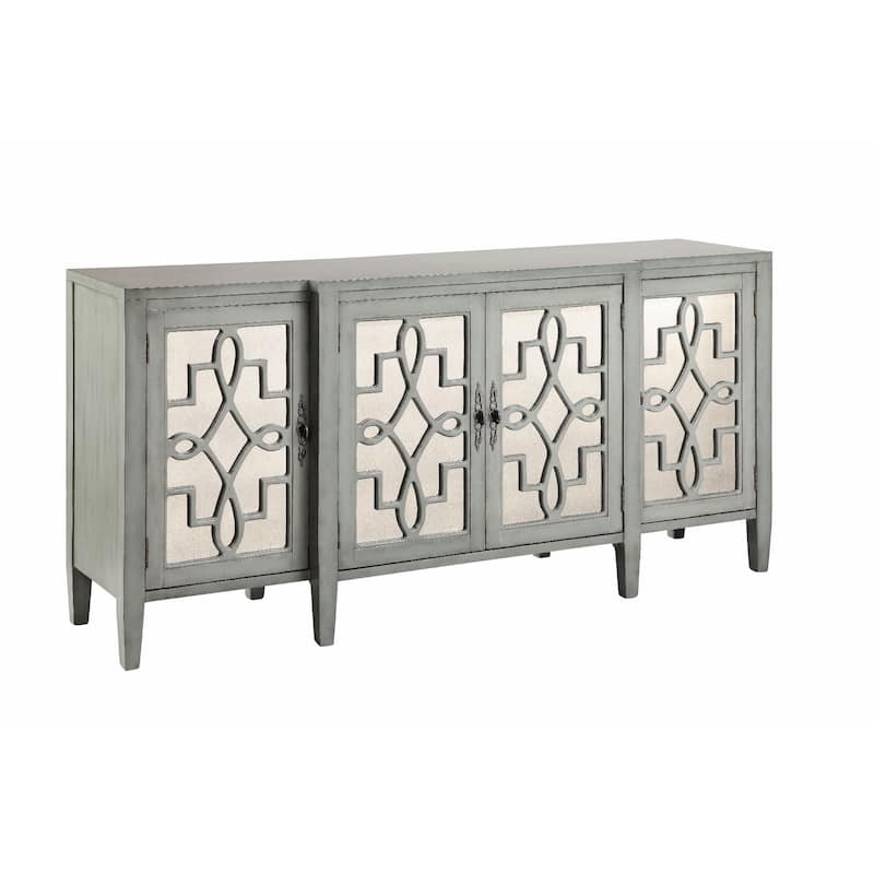 Add a touch of elegance to your decor with the Lawrence Credenza in Gray Blue. This four-door credenza features antique mirror glass set behind intricate open scroll fretwork, fixed interior shelves, and square tapered legs. The birch wood construction ensures durability while the blue-gray finish adds a calming and sophisticated touch to any room.