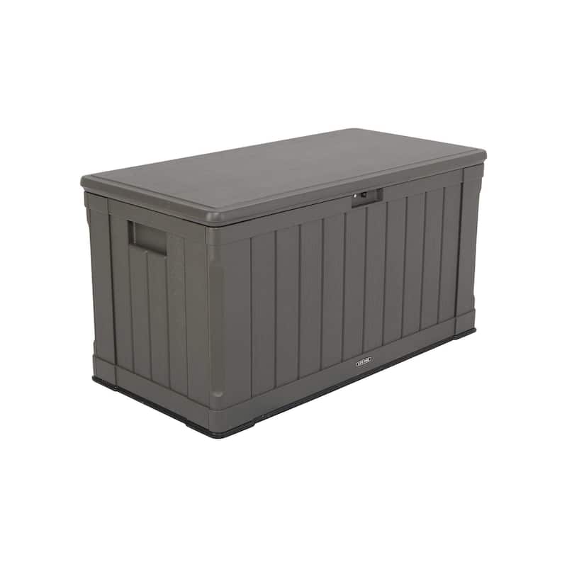 Need a more convenient place to store items around your yard? Lifetime’s Deck Boxes are the perfect way to expand your storage and get better access to items you use regularly around your yard. Whether you have gardening tools, lawn equipment, yard games, or even outdoor seat cushions, the Deck Box makes them easy to store and find when needed. It is durable, UV-protected, and weather resistant to ensure your belongings have years of protection. The lid is lockable (lock not included) to provide even greater security and has a controlled spring-hinge for easy opening and closing. It has molded side handles for easy transport making it easy to move around your yard or patio and it is even sturdy enough to be used as a bench. It has a black bottom, desert sand wood slat designed sides, and a brown lid. Comes in (1) box. The Lifetime Deck Box blends durability, convenience and style to create a versatile storage solution. 10-year limited warranty.