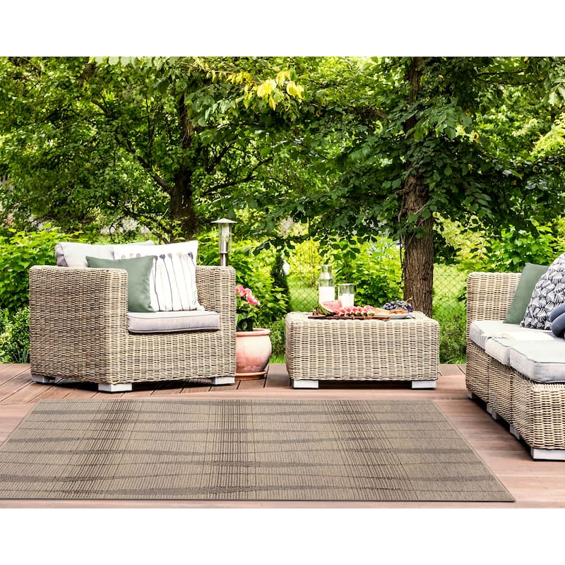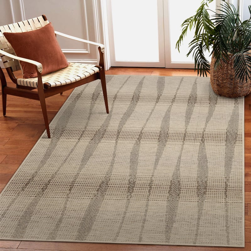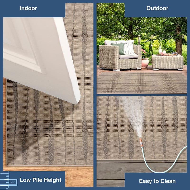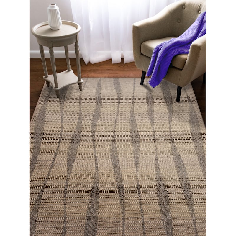 The Pinnacle area rug features geometric textured weave horizontal lines with an overlay of wavy stripes in dark and light neutral hues. The combination creates a stunning result and has the unique quality of being neutral enough to fit in most decor, yet interesting enough to make your room stand out. The Riviera Collection of area rugs is intended for both indoor and outdoor use. Crafted in a Power Loom construction with Durable, Fade resistant, UV Stabilized fibers. Great for high traffic areas of your home. Easy care and maintenance; Hose clean.