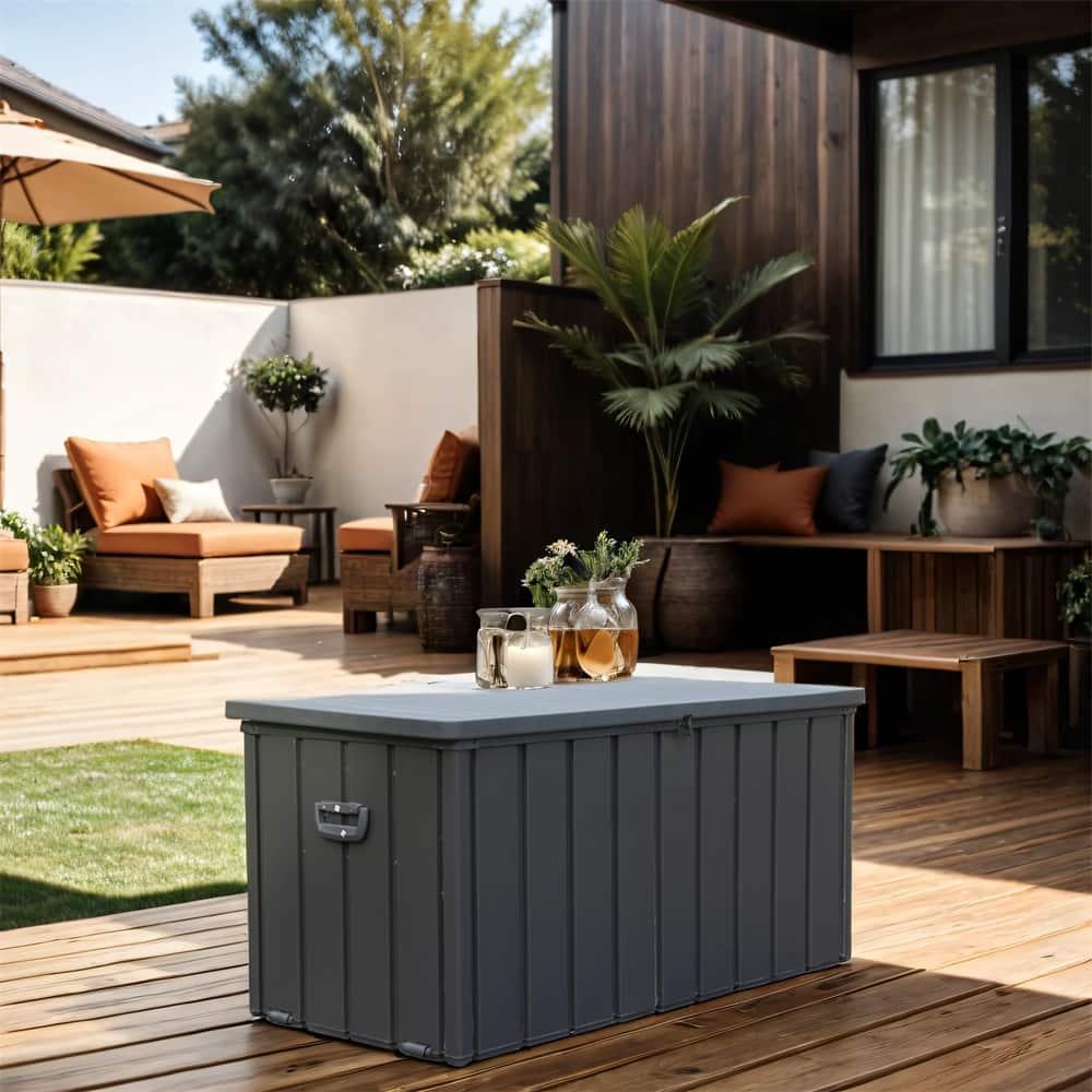 The outdoor deck box is the perfect solution to keep your outdoor equipment and tools neat, tidy and well-organized. Made of high-strength plastic material, this storage cabinet is waterproof, UV-resistant and corrosion-resistant, making it suitable for use in all types of weather conditions.