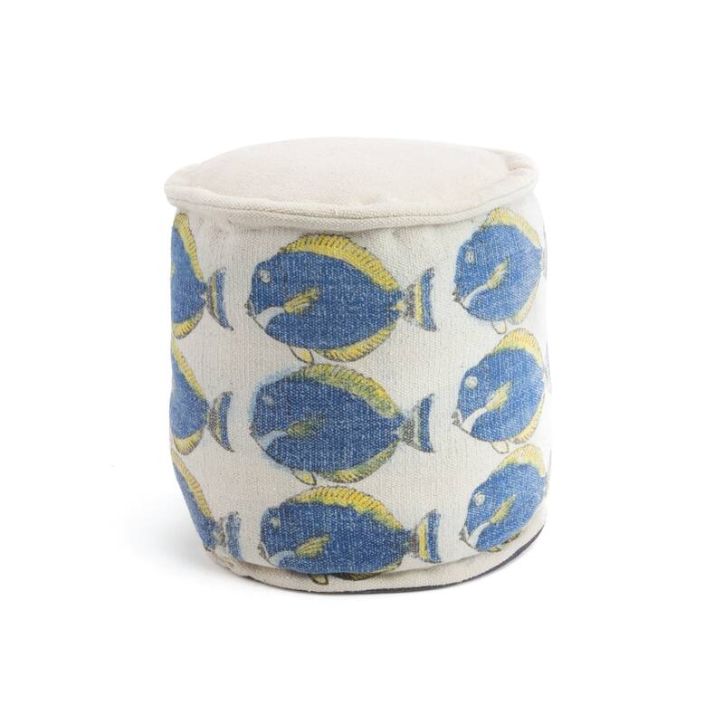Add a cozy seating option to your space with this whimsical wool pouf. A bright blue fish pattern pops out against natural wool fabric, bringing colorful character to this comfortable piece.