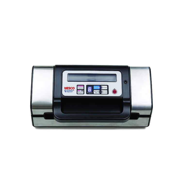 The new NESCO VS-12 Deluxe Vacuum Sealer gives you the ability to choose what settings work best for the food you are sealing. Choose from regular for firm items and gentle for softer foods. You can choose from multiple sealing options such as dry, moist, and double. The pulse vacuum option is great for sealing delicate items like buns and bakery. Simply press the manual seal button to double seal when you have reached the desired vacuum level. The deluxe vacuum sealer features a double vacuum pump for optimal performance and double line seals for added strength. Clear viewing window in lid and tab guides for better bag material positioning and sealing. This item also has a bag roll storage compartment and a bag cutter. Accommodates up to an 11.8 wide bag or roll. Unit includes one roll of bag material 8.7 x 9.85' and one roll of bag material 11 x 9.85'. Variable settings - Regular or Gentle Sealing choices - Dry, moist and double Double line seals for added strength Tab guides for better bag material positioning and sealing Accommodates up to an 11.8 wide bag or roll