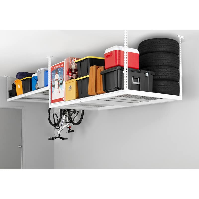 The NewAge Products VersaRac is an innovative solution for freeing up floor space in your garage or workshop. Durable and safe, the VersaRac is built with extra strong 13 gauge steel, with a rust and scratch resistant powder-coated finish, available in Gray and White. The heavy duty steel frames can support up to 600 lbs. of weight, and gives you up to 104 cu. ft. of overhead storage space to hold large and bulky items. The VersaRac is easy to install into wood joists and is adjustable in width from 6 ft. to 8 ft. allowing you to maximize your space while providing clearance for your doorway. It can be installed at a minimum height of 18 in. or can be adjusted from 27 in. to 42 in. in height. Store your winter tires, camping gear, or luggage within easy reach, while regaining space to park your car.