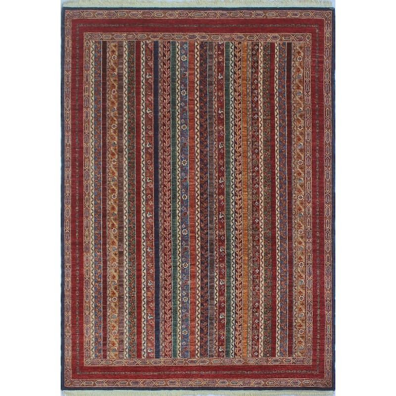 This is a high quality hand-knotted oriental rug with a striped tribal design. The main field color is made out of multicolored wool, natural fibers and a combination of other contrasting colors, such as, Red, Green, Rust, Blue, and Yellow. To extend the life of this rug, we recommend to always use a rug pad. Professional cleaning only.
