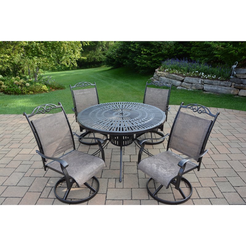Enjoy a leisurely afternoon watching your flourishing garden or lounging with family and guests with this five-piece Oakland Living dining set. Featuring rust-free steel, tubular aluminum, and polyester construction with a powder-coated finish, this waterproof and weather-resistant dining set stands up to outdoor elements for long-lasting beauty. The swivel rockers offer supreme comfort with their mild swivel and rocking motions.