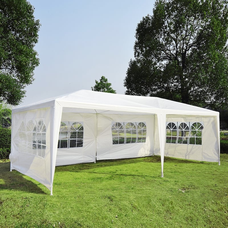 Enjoy the shade and protection of Outsunny's 10' x 20' Gazebo Canopy Tent, perfect for events of up to 30 people. Constructed with a sturdy metal frame and durable, water-resistant polyethylene cover, this tent blocks up to 90% of the sun's UV rays to keep your guests cool and safe. The four removable window side walls attach with hook and loop fasteners for easy assembly and removal. Ropes and stakes included.
