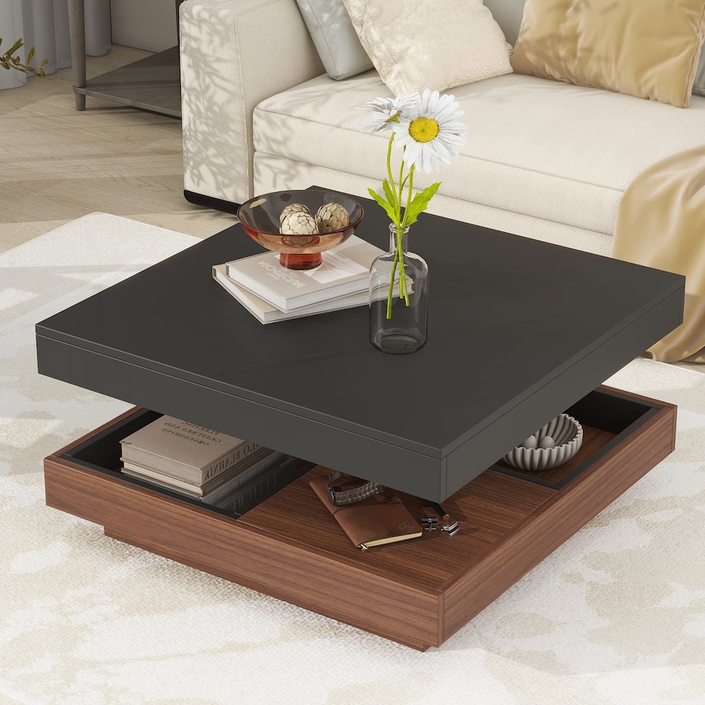 Roomfitters 360° Rotating Coffee Table with Storage, Modern Square 2-Tier Wood Center Table with Three Removable Trays