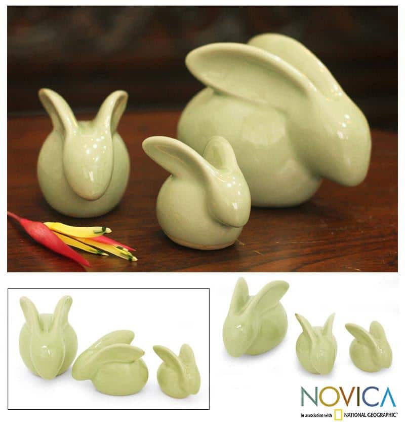 By Duangkamol, these whimsical figurines depict a mother rabbit and two baby bunnies. The Thai artisan works in cool green celadon ceramic to handcraft the charming figurine family.