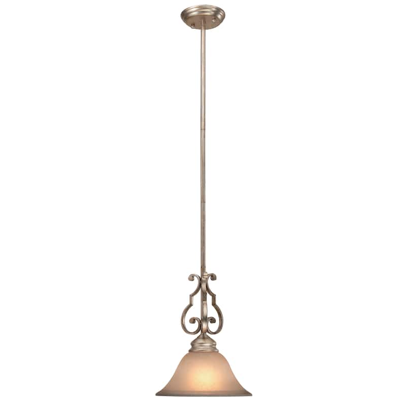 This one-light mini pendant achieves the perfect combination of silver and gold in a distressed twilight finish. The Shelby pendant wears this finish well, with graceful curves and amber hand-cut crystal drops and beads.