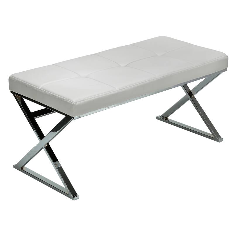 Complete your contemporary bedroom with this trendy chrome-finished bench. The x-shaped steel frame is topped with a faux-leather cushion, tufted for depth and classic style. Pair this clean, white piece with faux-fur pillows for a modern look.