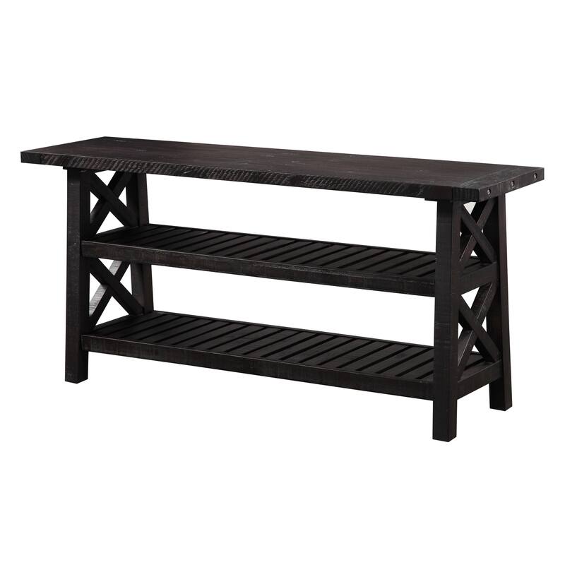 Create a contemporary yet casual looking living space with this slatted two-tier console table by Benzara. In rustic cafe brown and featuring cross-side panels, this elegant looking console table helps create a comfortable at-home feeling in your family room, and its open-back shelves offer the perfect place for your games and electronics. Crafted of solid pine wood, this durable table stands up to use in busy homes with kids running around, and the featured dents and saw marks that give it a rustic vibe help to disguise any future damage.
