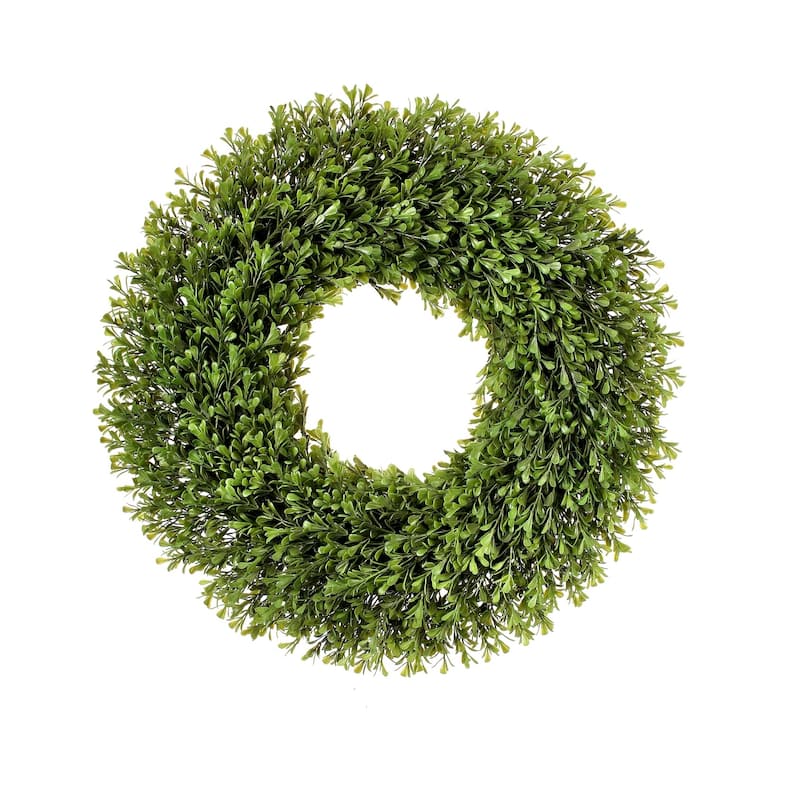 Sprigs of lush bright green boxwood are bound together to produce this 21-Inch Plastic Spring Boxwood wreath brings seamless appeal to your homes interior. This product arrives ready to hang for many years to come.
