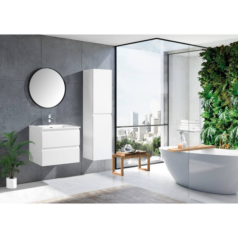 Brighten up your bathroom with the sleek and modern Frost Collection 24 Inch Floating Bathroom Vanity. Designed with contemporary European style in mind, this all-white vanity is a versatile choice for those seeking a simple approach or a contemporary feel. Its soft-closing double drawers provide seamless storage, while the elegant, high-gloss white lacquer finish adds a touch of sophistication. The Frost is an ideal choice for those who want the illusion of more space, making it perfect for smaller bathrooms.