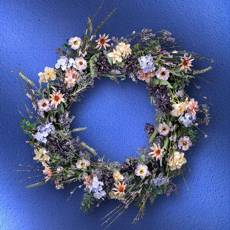 Nothing says Spring is here like pastel wildflowers & soft green foliage! This 24" wildflower wreath is bursting with charm. Brighten up a guest room or entryway with this lovely multicolored wall accent. Impress a friend or family member when you give this as a thoughtful house warming gift.