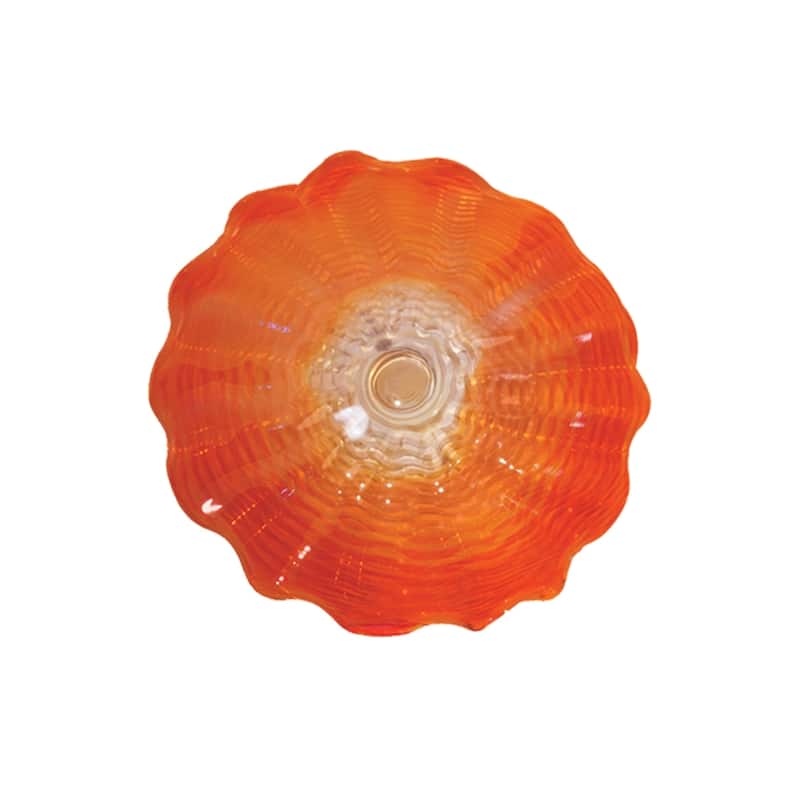 Add a touch of artistry to your walls with our Titan 9 Hand Blown Art Glass Wall Décor in Orange. The unique scalloped edges and swirls of red, orange, and amber colors make it a stunning conversation piece. This luxurious Favrile Art Glass piece comes with a hanging bracket, making it easy to display on your walls. You can also use it as a decorative centerpiece on your dining table or occasional table.