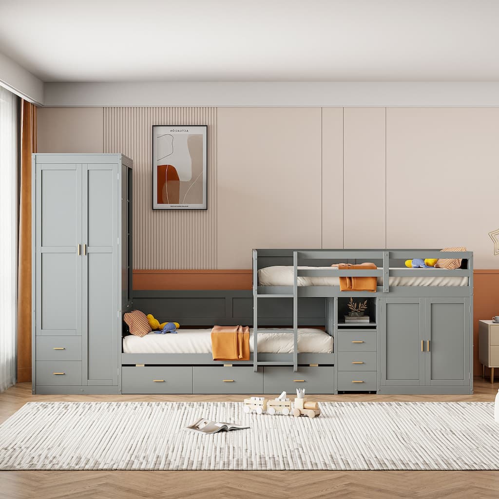 [Kids Twin Loft Bed With Multifunction]- The low loft bed with a retractable desk provides great convenience for studying and drawing. Also, the loft bed with a cabinet, 3 drawers, and 2 shelves in front of the loft bed provides an organized haven for books, toys, bedding, or any other items to stock.