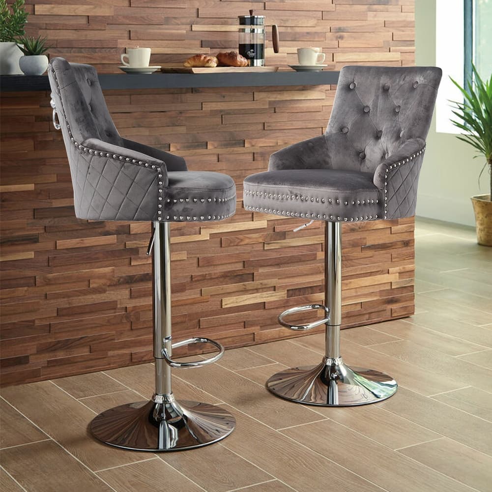 Velvet Bar Stool Set of 2, Adjustable Swivel Bar Stools with Silver Plated Metal Leg, Chrome Nailhead, Counter Height Chair