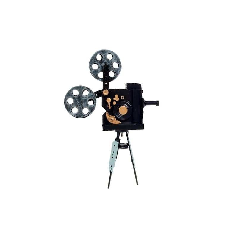 A movie projector is an optomechanical device for displaying motion picture film by projecting it onto a screen. Most of the optical and mechanical elements, except for the illumination and sound devices, are present in movie cameras. Our vintage movie projector is handmade out of the tin and covered in black rustic paint. It features many intricate details such as half-open case, two-reel system, lens, inching wheel, intermittent sprocket, sound head, focusing knob, and a stand. Proudly display this model anywhere you like and it will surely make a conversational piece. A must-have for the collector and enthusiast!