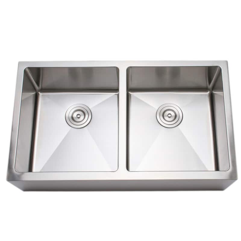 Featuring streamlined contemporary styling, this 9-inch deep 33-inch equal double bowl sink with apron front is handcrafted with 16 gauge premium Type 304 stainless steel, luxuriously heavy-duty for residential sinks. The mindful construction of the reserved radius corners adopts the same modern design scheme as zero-radius sinks, while maintaining more approachable soft edges that facilitate easy cleaning like a traditional sink. The classic symmetric configuration paired with the farmhouse style apron front makes this sink an easy choice if you are looking for something chic and classy, and having a rustic homey feel.