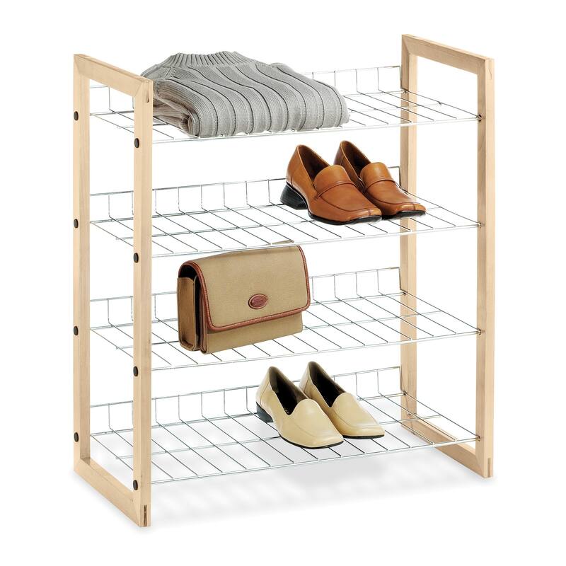 4-Tier Closet Shelf - Storage Organizer - Natural Wood, Chrome