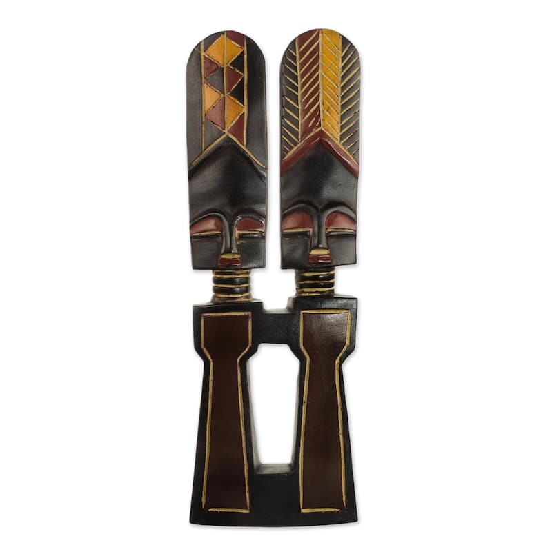 Two figures stand next to each other in this sculpture handcrafted by Joseph Boateng. The artisan crafts the sculpture using sese wood and finishes it using local clay and paint in shades of brown, yellow, and red. Joseph designs the sculpture to represent the value of confiding in another and working together to solve a problem.