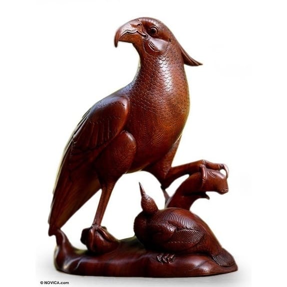 Proud and beautiful a hawk stands guard over her tiny hatchling. Wayan Rendah carves an image of powerful beauty, where the mother protects her young from predators. Suar wood lends its warm grain to a compelling and realistic nature sculpture.