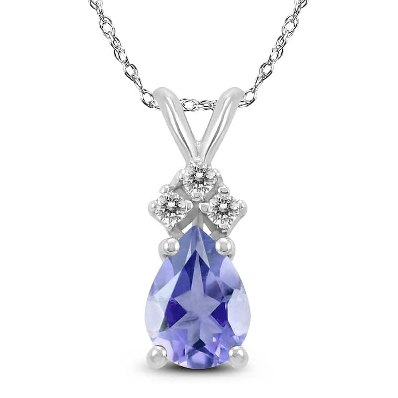 A beautiful 6x4mm pear shaped tanzanite and diamond pendant necklace set in a 14K white gold basket setting. 3 diamonds weigh 0.03 carat total weight. The pendant hangs from an 18 inch chain also crafted in 14K white gold.