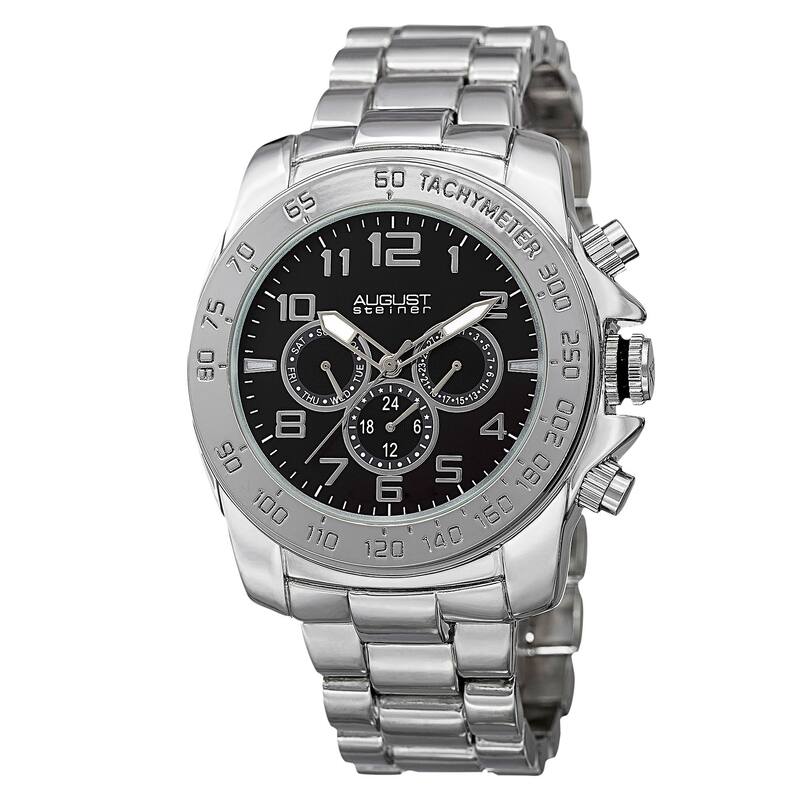 The precise August Steiner men's timepiece features the day, date, and GMT. This watch sports luminous hands and a tachymeter on the bezel. The Swiss quartz movement encompasses this remarkable masculine design making it a must-have for every man.