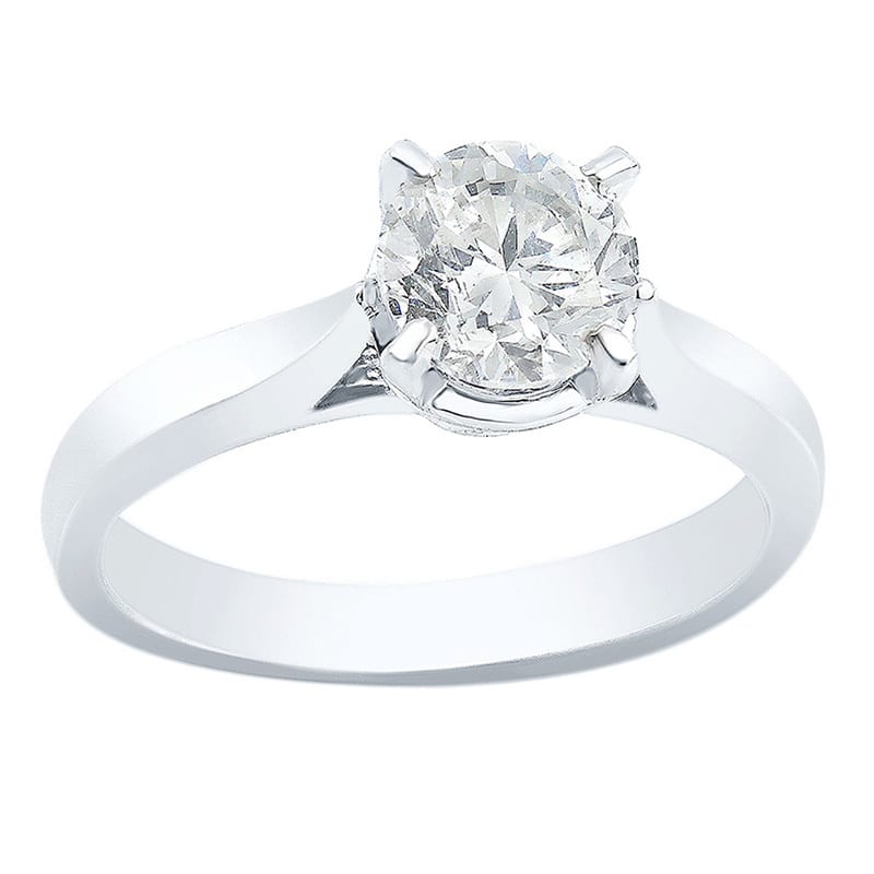 This classic solitaire ring features a GGL-certified clarity-enhanced round-cut diamond in cathedral four-prong setting. The ring is crafted of 14-karat white gold for a lustrous appearance.
