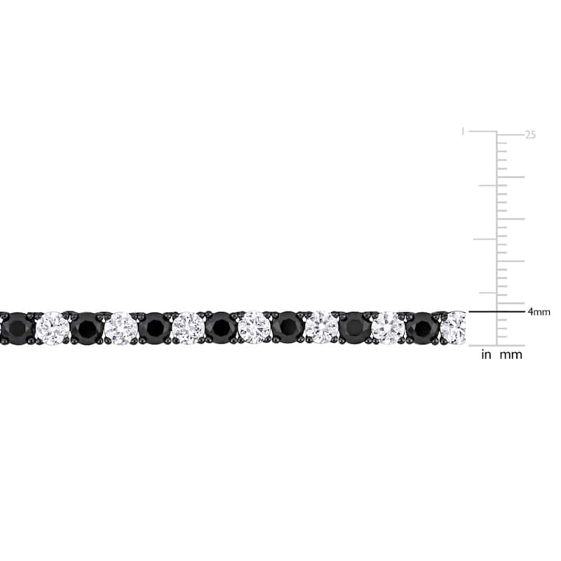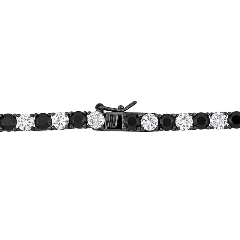 The Men's 40 1/4 CT TGW 4mm Round Created Black & White Sapphire Necklace with Box Clasp, a romantic and sophisticated piece from the Miadora Men's collection that masterfully blends timeless elegance with contemporary style.This exceptional necklace is expertly crafted in white and black rhodium plated sterling silver, providing a versatile and unique touch to any gentleman's ensemble.Featuring an exquisite array of 4mm round created black and white sapphires, this necklace boasts a total gem weight of 36 carats.The striking contrast between the captivating black sapphires and the luminous white sapphires creates a perfect harmony of elegance and modern sophistication.