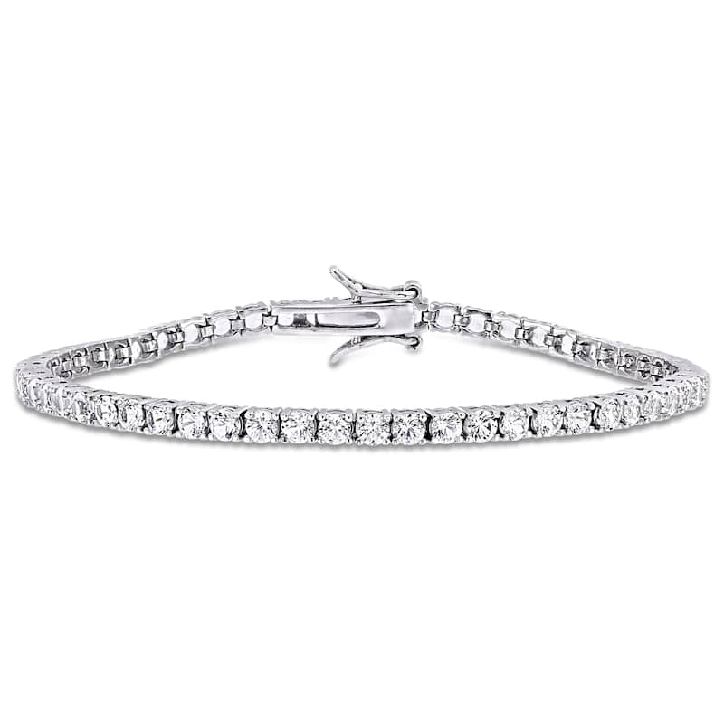 This delicate Miadora tennis bracelet is crafted in sterling sliver and features 55 round-cut cubic zirconia gemstones studded in a tennis pattern. Enhanced with a high polish finish, this glowing tennis gemstone bracelet is a timeless addition to any jewelry collection. Coordinate this simple yet classic cz tennis bracelet with any white attire for a stunning look.